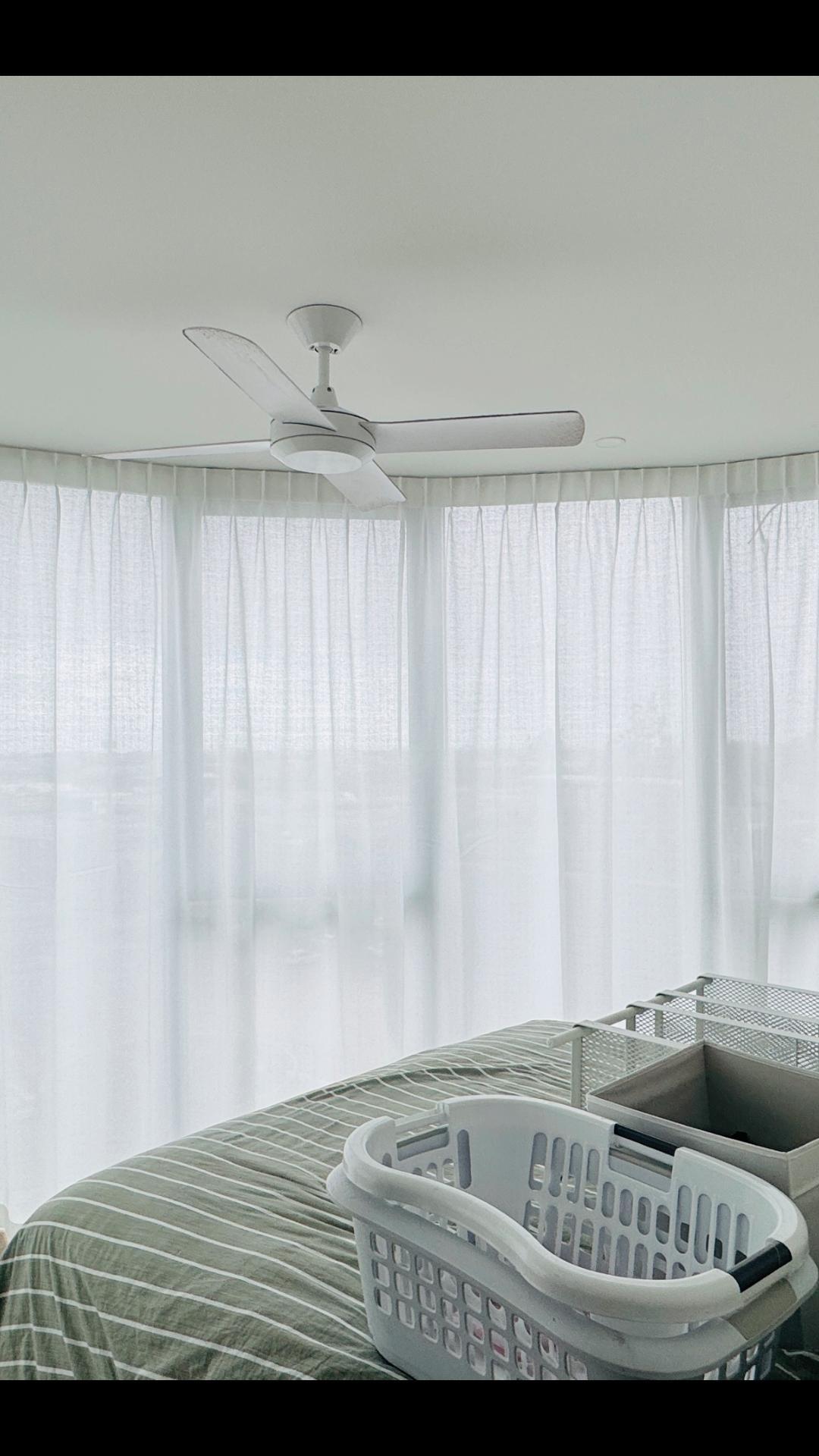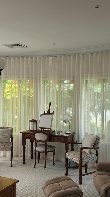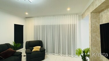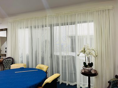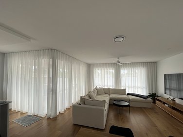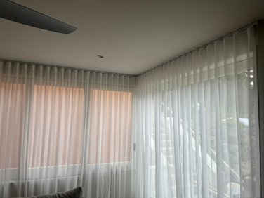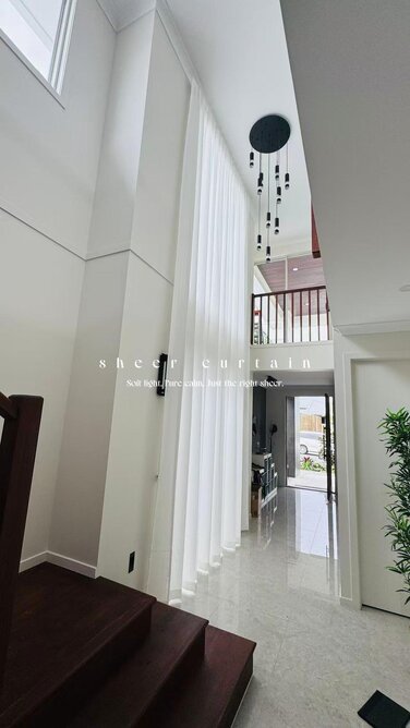 Installed both motorized roller blinds and sheer curtains on one window today. Privacy when you need it, soft light when you want it — best of both worlds.